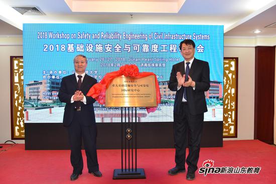 開幕式最后舉行了山東建筑大學(xué)重大基礎(chǔ)設(shè)施安全與可靠度國(guó)際研究中心揭牌儀式。張祝秀、陳國(guó)前共同為中心揭牌。