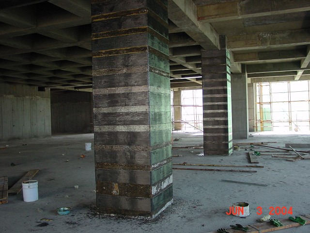 濟南永安大廈部分框架柱、梁采用粘貼碳纖維加固處理,現澆板收縮裂縫采用灌縫處理。
