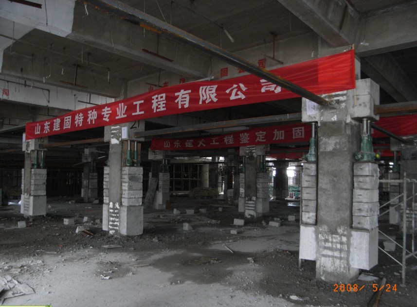 濟寧銀座商場(原華聯(lián)商廈)二期,為四層(局部六層)框架結(jié)構(gòu),建于1992年。原設(shè)計該建筑物的四層和五層層高為2.9m,現(xiàn)已不能滿足使用要求,每層需整體抬升1.1m。