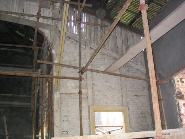 小廣寒影劇院原結構為磚、石、木、鋼混和結構。墻體由亂石、粘土磚用粘土、石灰雜砌而成,中間為鋼柱-鋼梁支撐,屋架為木結構,屋面為鐵皮屋面。室內頂棚為板條麻刀粘土石灰頂棚,隔墻為木柱、木腰梁半磚隔墻。看臺為木結構看臺,木樓梯。小廣寒影劇院因年久失修,磚石墻、屋架、看臺、隔墻等大部分已破損、腐爛。本次修繕工作本著“修舊如舊”的原則,對建筑物進行了針對性的改造加固