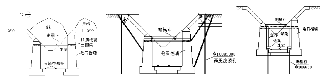 某鋼廠原料場受料槽建于1966年,其皮帶通廊位于地面以下,通廊墻壁采用毛石砌筑,墻壁下為毛石基礎,料倉料斗支承在鋼梁上,鋼梁支撐在毛石墻上(圖1)。地面以上采用鋼筋混凝土框架結構,上部結構總裝圖見圖2。該鋼廠1966年的鋼鐵年產量為約100萬噸,2004年年產量達到640萬噸,2005年年產量預計在1000萬噸。由于原料場受料槽的建設速度遠遠低于鋼鐵產量的增長速度,使得該原料場受料槽一直處于超負荷運轉。經過40多年的運轉,該原料場綜合受料槽各部件出現不同程度的損壞。