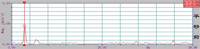 平移前的測(cè)試結(jié)果:根據(jù)實(shí)測(cè)的實(shí)時(shí)譜曲線,平移前二層樓面振動(dòng)測(cè)點(diǎn)的主頻為2.84HZ(振動(dòng)周期0.35s)。