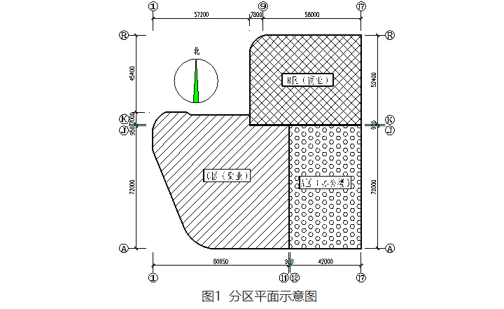 本工程地下部分連為整體,地上部分設置抗震縫,將整個結構分為三個獨立的結構單元:超高層辦公樓及與之連為一體的裙樓部分為A區,A區北側的商業裙樓部分為B區,A區西側的商業裙樓部分為C區,青島銀座結構分區示意圖見圖1。